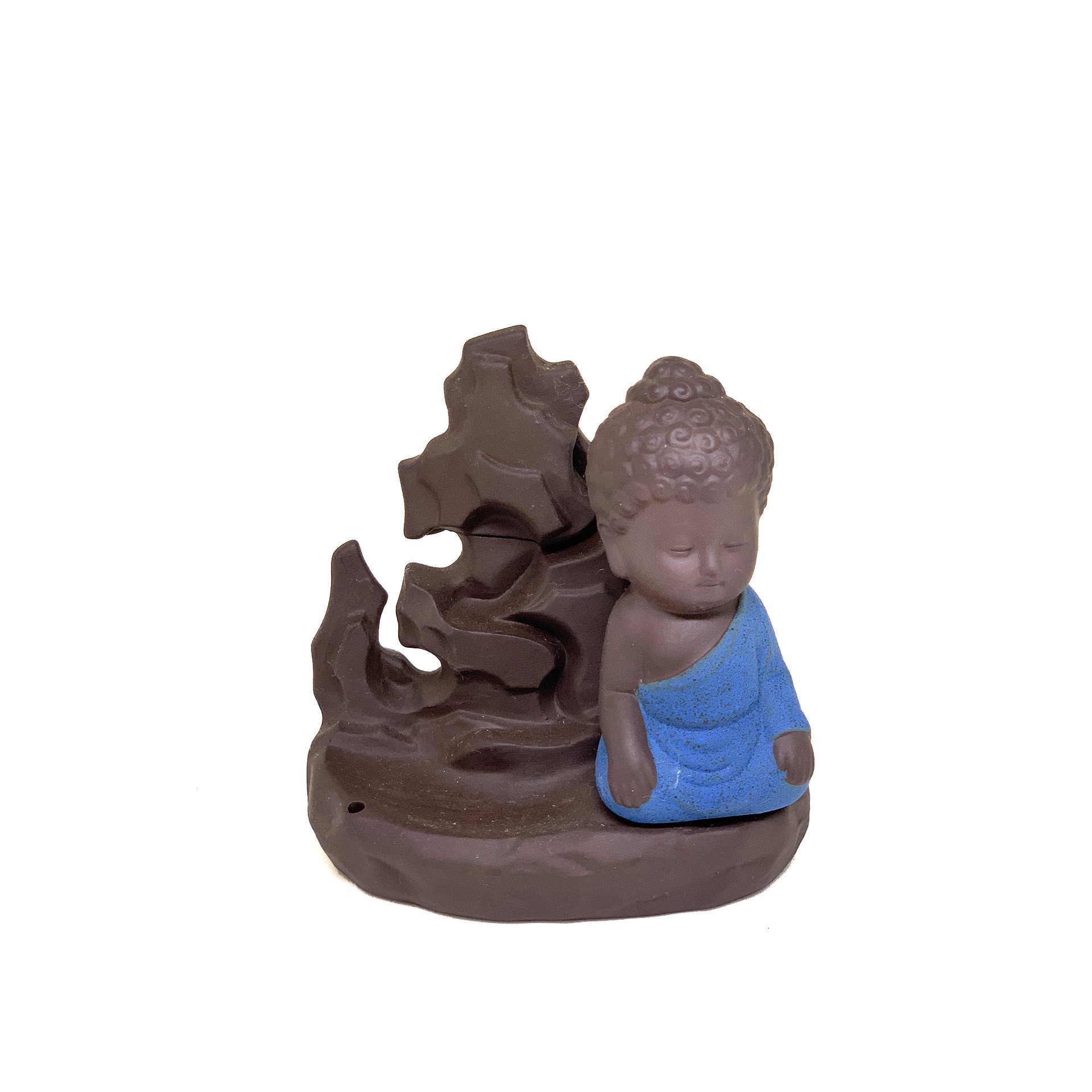 Incensário Cascata Cerâmica Com Monge Da Benção Marrom/Azul